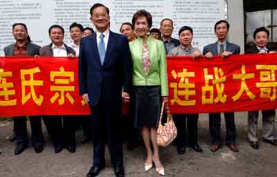 Chinese Kuomintang Honorary Chairman Lien Chan (L) and his wife Lien Fang-yu take a photo with local people holding a welcome banner during their visit to Yongquan Temple in Mawei, southeast China's Fujian Province, on April 18, 2006. [Xinhua]