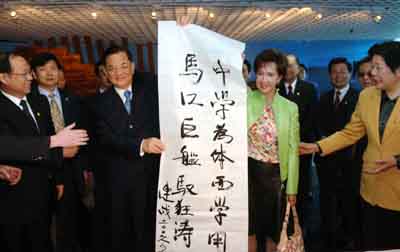 Chinese Kuomintang Honorary Chairman Lien Chan (C L) and his wife Lien Fang-yu (C R) show his inscription during their visit to a ship culture museum in Mawei, southeast China's Fujian Province, on April 18, 2006. [Xinhua] |