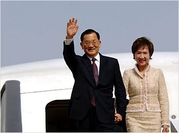 Lien Chan (L), honorary chairman of the Chinese Kuomintang (KMT), waves as he and his wife Lien Fang-yu arrive at Capital International Airport in Beijing on April 13, 2006.