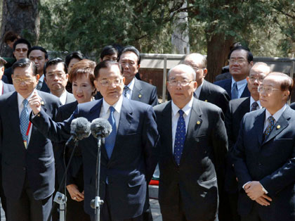 Lien Chan (C), former chairman of Taiwan's opposition Kuomingtang, delivers a speech during his visit at the Biyun Temple in Beijing April 15, 2006. Taiwan opposition politicians and Chinese Communist leaders urged Taipei on Friday to allow regular direct flights and expand trade with China, raising pressure on the island's independence-leaning leader. [Xinhua] |