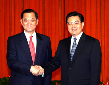 | Hu Jintao (R), General Secretary of the Communist Party of China (CPC) Central Committee, meets with Honorary Chairman of the Chinese Kuomintang (KMT) Lien Chan at the Great Hall of the People in Beijing, capital of China, April 16, 2006. (Xinhua Photo) | |