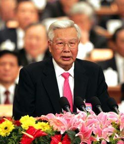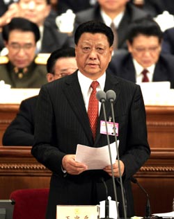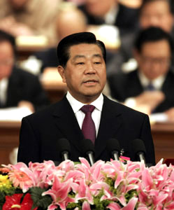 Jia Qinglin, chairman of the Tenth National Committee of the Chinese People's Political Consultative Conference (CPPCC), delivers a report on the work of the CPPCC National Committee's Standing Committee over the past year, at the Great Hall of the People in Beijing, March 3, 2006. The Fourth Session of the Tenth National Committee of the CPPCC opened in Beijing on Friday. [Xinhua Photo]