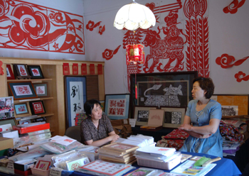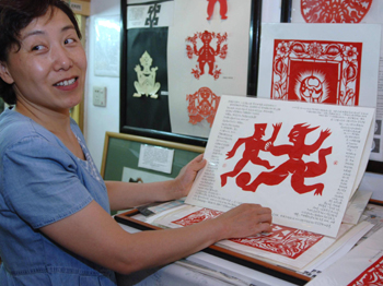Chinese paper-cutting artist Liu Ren (L) is invited to take part in an activity for the Chinese Cultural Heritage Day with her creations in Beijing, capital of China, June 10, 2006. [Xinhua Photo]