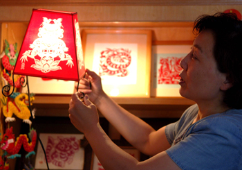Chinese paper-cutting artist Liu Ren displays a festive lantern with her creations on at home in Beijing, capital of China, June 8, 2006. [Xinhua Photo]