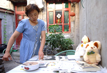 Chinese paper-cutting artist Liu Ren works at home in Beijing, capital of China, June 8, 2006. As an infatuate of Chinese traditional paper-cutting, Liu Ren set up a paper-cutting home museum in 1999 for the purpose of carrying forward the traditional handicraft and sharing with others the joy brought by paper-cutting. Fanciers of Chinese paper-cutting from more than 30 countries and regions have visited her household museum after its establishment.[Xinhua Photo]
