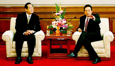 Chen Yunlin (R), director of the Taiwan Affairs Office of the State Council, talks with Tseng Yung-Chuan, head of Taiwan's Kuomintang group in Beijing February 22, 2006. [Reuters/file]