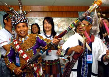 A man from southeast China's Taiwan province performs on a yacht as he tours on the Lijiang River in Guilin, a tourist resort in southwest China's Guangxi Zhuang Autonomous Region March 30, 2006. These Taiwanese, who were invited to attend traditional singing festival of the Zhuang ethnic group, visited Lijiang River Thursday. The song fair on March 3 on the Chinese lunar calendar, falls on March 31 this year. [Xinhua Photo]