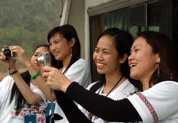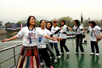 Girls from southeast China's Taiwan province dance on a yacht as they tour on the Lijiang River in Guilin, a tourist resort in southwest China's Guangxi Zhuang Autonomous Region March 30, 2006. [Xinhua Photo]