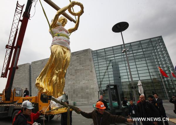 The "Golden Lady" statue is seen lifted up as to be packed in east China's Shanghai, Nov. 2, 2010. The Luxembourg's national treasure exhibited in 2010 Shanghai World Expo was ready for her home trip here on Tuesday. Created by Luxembourg's renowned artist Claus Cito in 1923, the "Golden Lady" is dedicated to the thousands of Luxembourgers for their volunteer service in the armed forces during the World War I. (Xinhua/Pei Xin) |