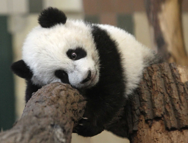 Five-month-old giant panda cub Fu Hu (meaning lucky tiger) climbs on a tree trunk in its enclosure at the zoo in Vienna, February 8, 2011. The cub of pandas Yang Yang and Long Hui was born on August 23 in the zoo. Fu Hu's parents were transferred from China to Schoenbrunn Zoo in 2003, and are on loan to Austria by China for a period of 10 years. (Xinhua/Reuters Photo)