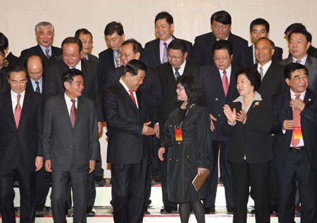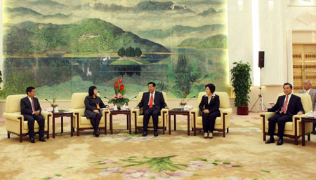 Jia Qinglin (3rd L, front), member of the Standing Committee of the Political Bureau of the Communist Party of China Central Committee, who is also chairman of the National Committee of the Chinese People's Political Consultative Conference, meets with trade union representatives from Taiwan Province in Beijing, Nov. 3, 2009. (Xinhua/Liu Weibing)