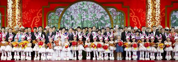 China's leaders Hu Jintao, Wu Bangguo, Wen Jiabao, Jia Qinglin, Li Changchun, Xi Jinping, Li Keqiang, He Guoqiang and Zhou Yongkang pose for a group photo with performers at the end of a gala to celebrate the traditional Lantern Festival at the Great Hall of the People in Beijing, capital of China, on Feb. 17, 2011. The Communist Party of China (CPC) Central Committee on Thursday night hosted a gala to celebrate the traditional Lantern Festival. (Xinhua/Li Xueren)