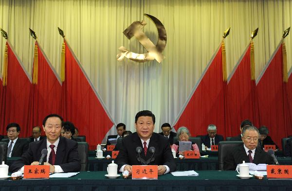 Chinese Vice President Xi Jinping (C, Front), who is also a member of the Standing Committee of the Political Bureau of the Communist Party of China (CPC) Central Committee, speaks at a meeting marking 90 years of the CPC's diplomatic work and the 60th anniversary of the establishment of the International Department of the CPC Central Committee, in Beijing, capital of China, Jan. 17, 2011. (Xinhua/Ma Zhancheng)