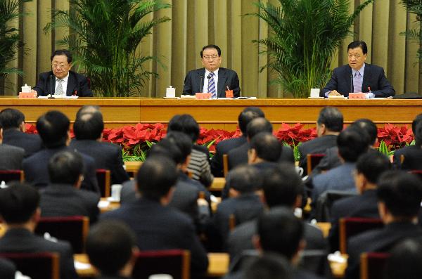 Li Changchun (C), a member of the Standing Committee of the Political Bureau of the Communist Party of China (CPC) Central Committee, and Liu Yunshan (R), head of the Publicity Department of the CPC Central Committee, attend a national meeting of CPC publicity officials in Beijing, capital of China, Jan. 5, 2011. The meeting closed Wednesday. (Xinhua/Ma Zhancheng)