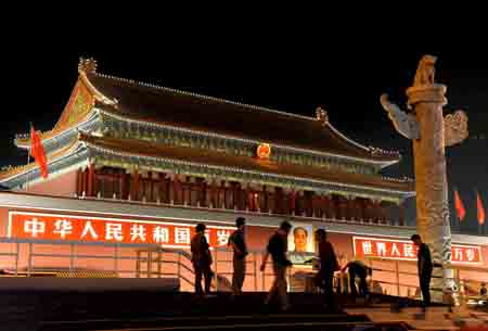 People are seen in front of the illuminated Tian'anmen Gate Tower in Beijing, capital of China, Sept. 14, 2009. A total of 21 lighting installations in the city have been fixed or renovated for the celebration of the 60th anniversary of the founding of the People's Republic of China, which falls on Oct. 1. (Xinhua/Luo Xiaoguang)