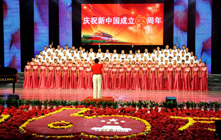 An amateur chorus performs the repertoire of odes in the revolutionary songs, during the large song-singing contest on Long Lives to the Homeland and Songs Flying Over Lianyungang City, which attracts over 5,000 cadres in 72 delegations to participate in, in Lianyungang City, east China's Jiangsu Province, Sept. 13, 2009. (Xinhua/Wang Chun)