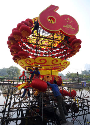 Workers install lanterns at a park in Lanzhou, capital of northwest China's Gansu Province, Sept. 22, 2009. Parks and other scenic sites of the city are decorated to celebrate the 60th anniversary of the founding of the People's Republic of China which falls on Oct. 1.(Xinhua/Han Chuanhao)