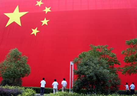 People look at a huge Chinese national flag with the area of 960 square meters, which is made to mark the upcoming 60th anniversary of the founding of the People's Republic of China, in Changxing, a city of east China's Zhejiang Province, Sept. 28, 2009. (Xinhua/Yue Deliang)