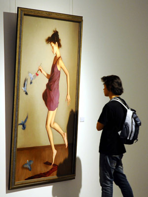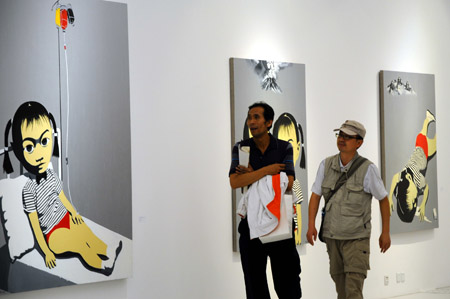 Visitors view the painting exhibition "prophesy-parable" at 798 Art Zone in Beijing, capital of China, Sept. 19, 2009.(Xinhua/Fan Jiashan)
