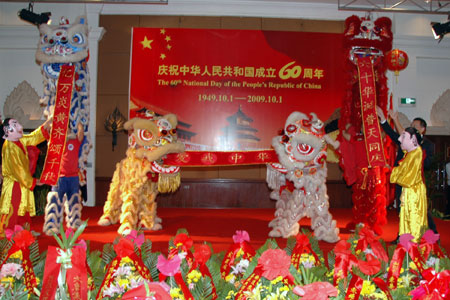 Members of a local Chinese association perform lion dance in an evening to celebrate the 60th anniversary of founding of the People's Republic of China in Phnom Penh, capital of Cambodia, Sept. 25, 2009. (Xinhua/Lei Baisong)