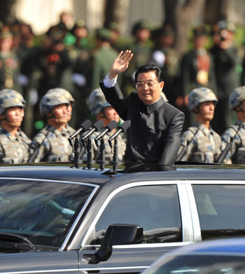 Hu Jintao, general secretary of the Central Committee of the Communist Party of China, Chinese president and chairman of the Central Military Commission, goes by car inspecting troops of the Chinese People's Liberation Army to take part in a military parade for celebration of the 60th anniversary of the founding of the People's Republic of China, in central Beijing, capital of China, Oct. 1, 2009. (Xinhua Photo)