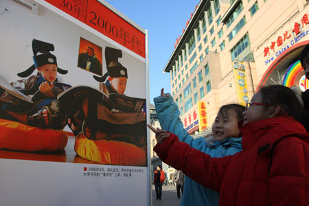 Two girls look at a photo during an exhibition in Beijing's Wangfujing area, Dec. 17, 2008. The show features about 800 photos taken across the country during the past three decades to highlight the major changes China has gone through since 1978. (Photo: China Daily/Asianewsphoto)