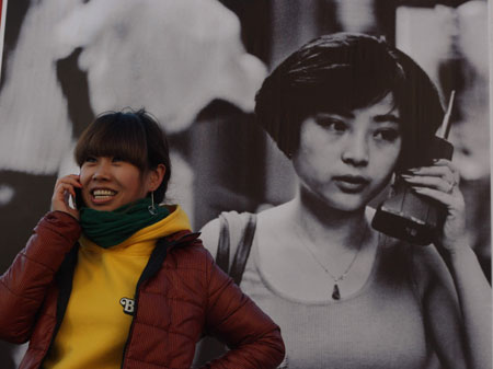A woman talks on her cell phone in front of a photo which was taken in the 1990s and showed a woman using an old-fashionedmobile device, Dec. 18, 2008. The show features about 800 photos taken across the country during the past three decades to highlight the major changes China has gone through since 1978. (Photo: China Daily/Asianewsphoto)