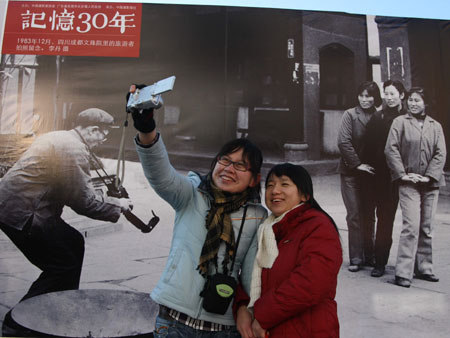 Two girls have their pictures taken at a photo exhibition in Beijing's Wangfujing area, Dec. 17, 2008. The show features about 800 photos taken across the country during the past three decades to highlight the major changes China has gone through since 1978. (Photo: China Daily/Asianewsphoto)