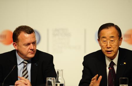 UN Secretary-General Ban Ki-moon (L) and Danish Prime Minister Lars Lokke Rasmussen attend the opening ceremony of the high-level segment of UN Climate Change Conference in Copenhagen, capital of Denmark, Dec.15, 2009. (Xinhua/Wu Wei)