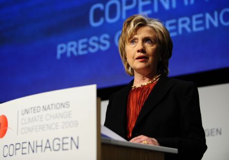 U.S. Secretary of State Hilary Clinton addresses a press briefing during the United Nations Framework Climate Change Conference in Copenhagen, Denmark, Dec. 17, 2009. (Xinhua/Zeng Yi)