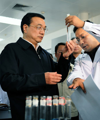 Chinese Vice Premier Li Keqiang (C) visits the Chinese Research Academy of Environmental Sciences in Beijing, capital of China, Dec. 8, 2009. (Xinhua/Liu Jiansheng)