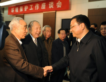 Chinese Vice Premier Li Keqiang (R) meets with experts during a symposium on environmental protection in Beijing, capital of China, Dec. 8, 2009. (Xinhua/Liu Jiansheng)