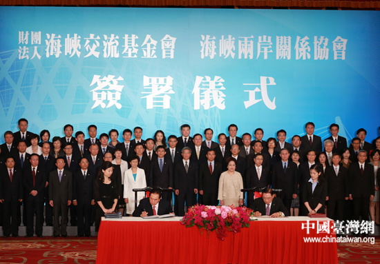 The two pacts were signed by Chen Yunlin, president of the Chinese mainland-based Association for Relations Across the Taiwan Straits (ARATS) and Chiang Pin-kung, chairman of the Taiwan-based Straits Exchange Foundation (SEF), at their eighth round of talks held since 2008.