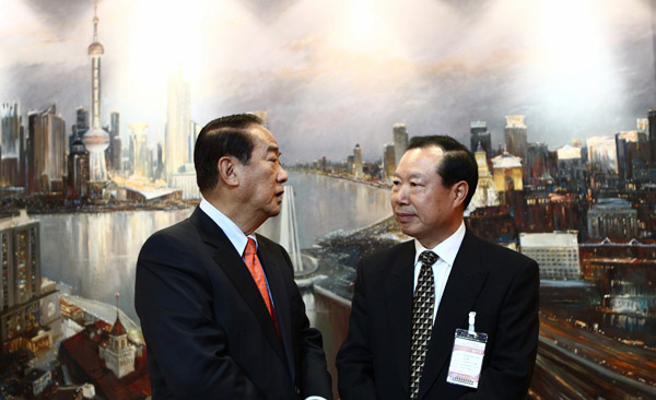 Wang Zaixi (R), vice president of the mainland's Association for Relations Across the Taiwan Straits (ARATS), talks with the People First Party Chairman James Soong, in Shanghai, east China, on April 28, 2010. James Soong arrived in Shanghai Wednesday for the World Expo that is scheduled to open on May 1. (Xinhua/Xing Guangli)