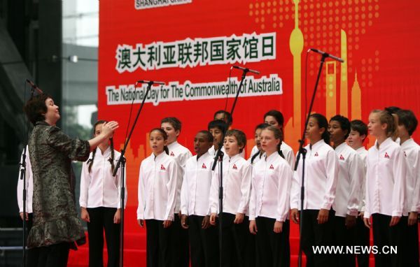 Children from Australia perform during the celebration of the National Pavilion Day of Australia in the World Expo Park in Shanghai, east China, on June 8, 2010. (Xinhua/Li Baishun)