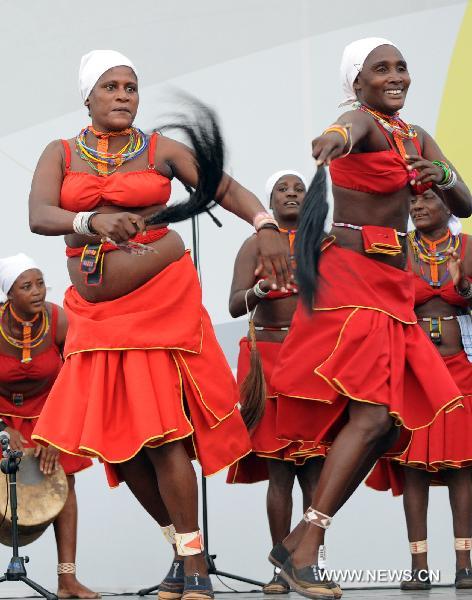 Actresses of a Namibian performance troupe perform folk dance at Africa Square in the World Expo park in Shanghai, east China, on June 9, 2010. (Xinhua/Jiang Lin)