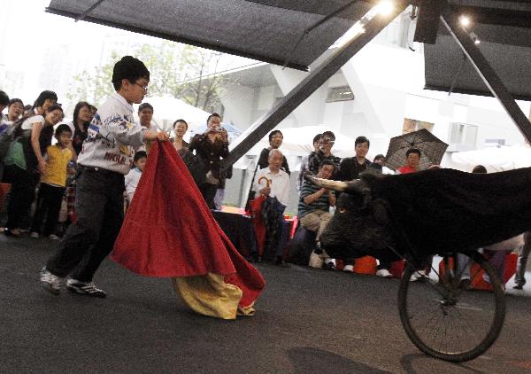 A boy plays the role of a bullfighter during a performance at the Madrid Case Pavilion of Urban Best Practices Area (UBPA) at the World Expo Park in Shanghai, east China, on June 10, 2010. (Xinhua/Liu Ying)