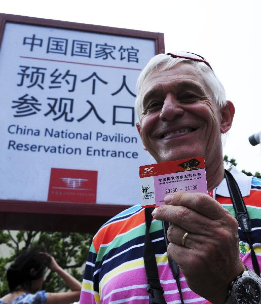 A visitor shows his electronic reservation ticket in the Shanghai World Expo Park in Shanghai, east China, Aug. 6, 2010. Electronic reservation tickets are taken test application in China Pavilion on Friday. (Xinhua/Li Baishun)