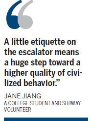 Jane Jiang, a college student who has been volunteering at People's Square station for two years to promote "standing on the right, climbing on the left", said volunteers and metro staff have tried several measures such as giving little gifts to encourage passengers to follow the rule.