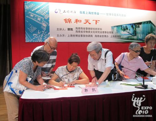 As one of the Expo 2010 Hainan Week activities, a lecture was held yesterday at Shanghai Library to let more people appretiate the beautiful brocade made by Li people, an ethnic minority in Hainan Province.
