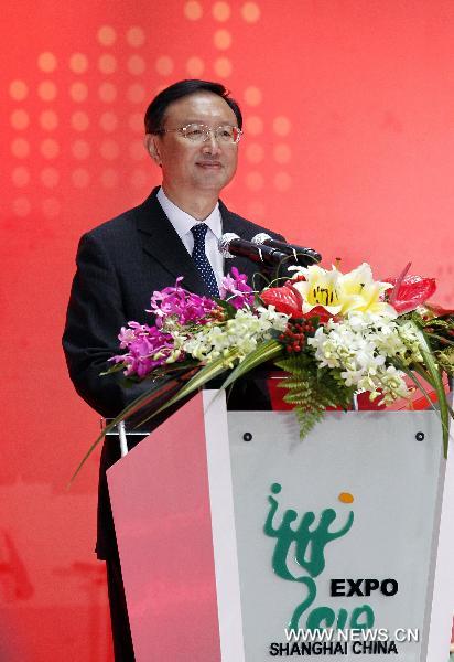 Chinese Foreign Minister Yang Jiechi addresses the ceremony celebrating the National Pavilion Day for the Republic of Togo at the 2010 World Expo in Shanghai, east China, Aug.20, 2010. (Xinhua/Liu Ying)