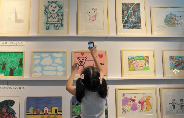 A girl takes photos of drawings created by autistic children at Swedish Pavilion in the World Expo park in Shanghai, east China, Aug. 20, 2010. Autistic children from China and Singapore will display their works in Swedish Pavilion and UK Pavilion for nearly three weeks. (Xinhua/Zhou Hua)