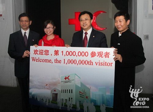 Wang Junjun (Second left) becomes 1 millionth visitor to the International Red Cross & Red Crescent Pavilion.
