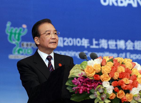 Chinese Premier Wen Jiabao addresses the opening ceremony of the Expo 2010 Shanghai China Summit Forum held in Shanghai, east China, Oct. 31, 2010. The Shanghai World Expo 2010 is set to be closed later here Sunday.(Xinhua/Pang Xinglei)