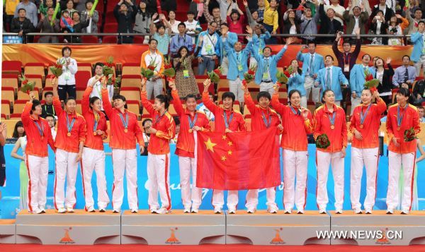 China's players stand on the podium during awarding ceremony of the women's basketball at the 16th Asian Games in Guangzhou, south China's Guangdong Province, Nov. 25, 2010. China won the final by 70-64 and grabbed the gold medal. (Xinhua/Meng Yongmin)