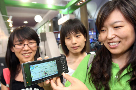 A female presents a stylish portable inter-communicative onboard navigator, during the National Exposition on Geographic Information Applications and Maps, which opens at the Beijing Exhibition Center, in Beijing, July 1, 2009. The exposition, on the motif of intensifying the service of geographic information application and promoting its industrialization, epitomizes its application in national economy, social development and people's livings since the 60 years of the founding of the People's Republic of China. (Xinhua/Chen Xiaogen)