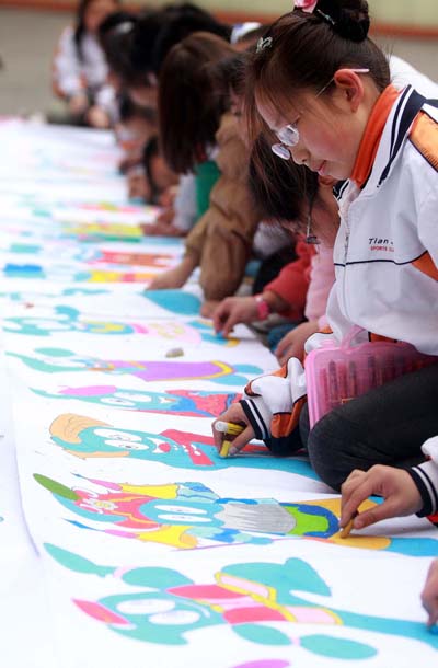 Pupils of a primary school draw Haibao, the mascot of Shanghai World Expo, on a painting in Harbin, northeast China's Heilongjiang Province, April 29, 2010. Some 300 teachers and students here on Thursday drew a total of 2010 Haibao on ten scrolls of paintings on the eve of the opening of Shanghai World Expo. (Xinhua/Liang Dong)