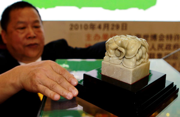 A staff member displays a Shoushan Stone seal in Shanghai, east China, April 29, 2010. Over 200 types of World Expo licensed Shoushan Stone seals were put into the market on Thursday. Shoushan stone, mined in the Shoushan village of China's southeast Fujian Province, have long been used to produce handicrafts and seals. (Xinhua/Ren Long)