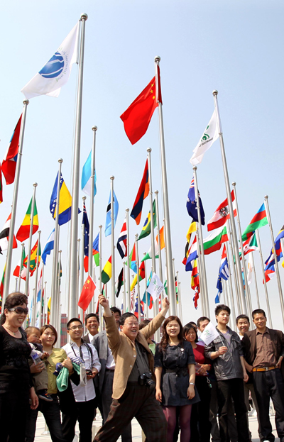 Visitors pose for photos at the Flags Square in the World Expo Park in Shanghai, east China, on May 1, 2010. Shanghai World Expo park formally opened to the public on Saturday. (Xinhua/Fan Jun)