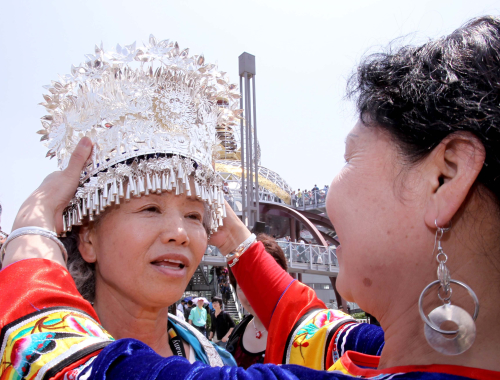 A woman of the Miao nationality puts a traditional headpiece on Tomiyo Yamada at the Expo Park May 1.[Xinhua]